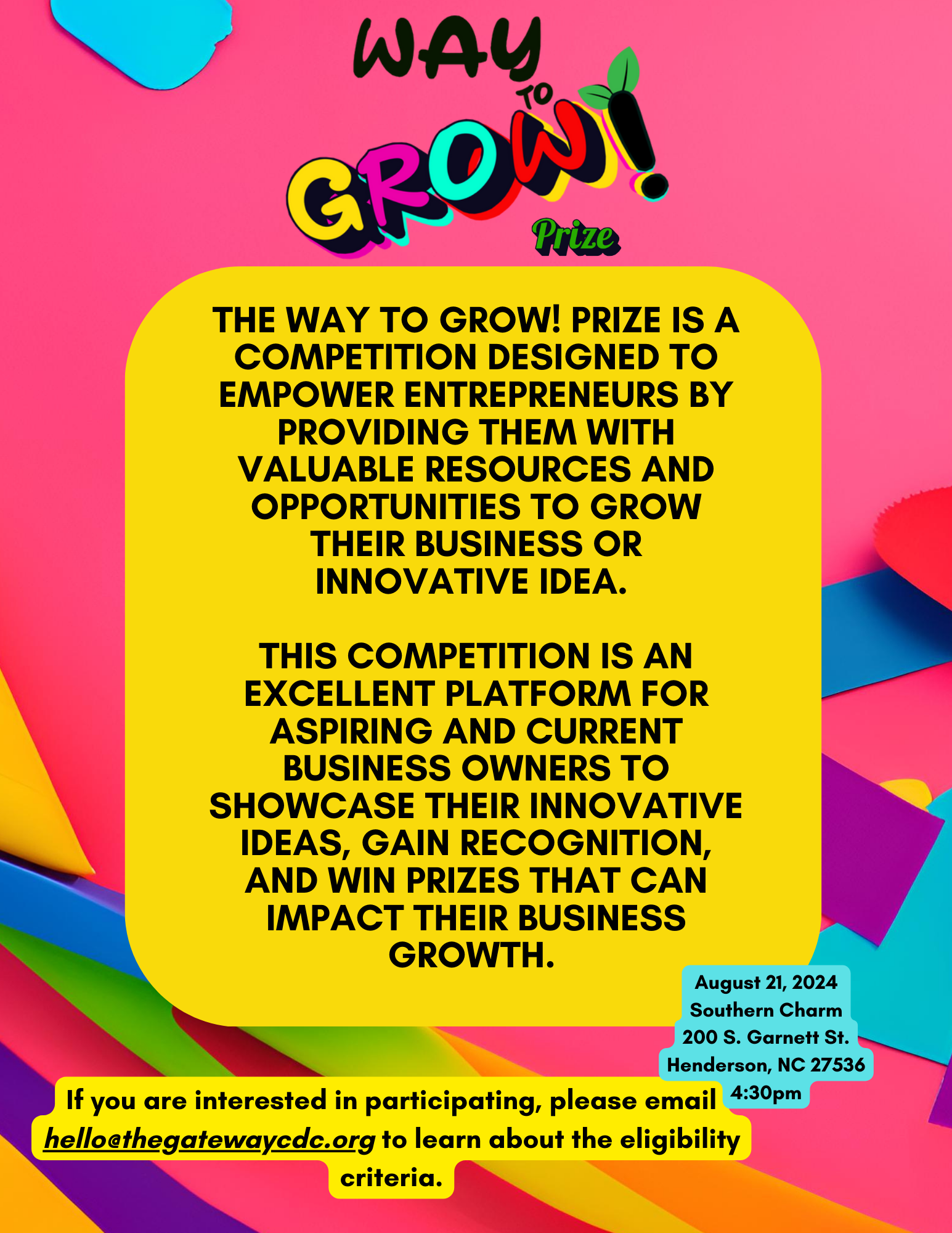 Themed "Way to GROW! Homecoming," this weeklong event is filled with an array of activities designed to foster community connection and remind us why we love the place we call HOME. This festival features live performances and the Way to GROW! Youth Village. With over 50 vendors, the festival also serves as a marketplace showcasing a wide variety of crafts, foods, and services, enabling businesses and artisans to connect directly with the community. More details and vendor signup coming soon!